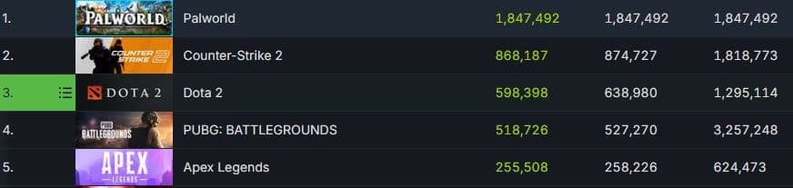 Проект японской студии Pocketpair стал второй самой популярной игрой за всю историю Steam, уступая только PUBG: Battlegrounds, пиковый онлайн которой в определенный момент достиг 3,257,248.