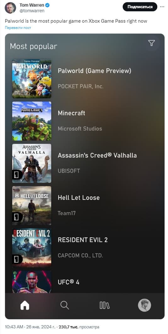 Главный редактор The Verge Том Уоррен отметил, что на данный момент Palworld - самая популярная игра, доступной в подписке Xbox Game Pass. По популярности она опережает даже Minecraft, Resident Evil 2 и Assassin's Creed Valhalla.