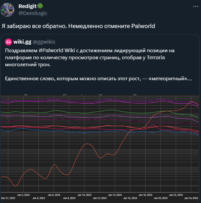 Один из создателей Terraria под ником Redigit обратил внимание на статистику wiki.gg. Оказывается, wiki по недавно вышедшей Palworld стала самой популярной, отобрав многолетнее лидерство у Terraria.