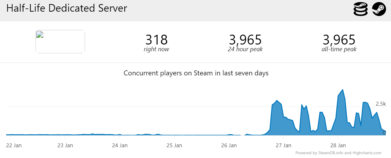 Также высокая активность замечена у Half-Life Dedicated Server. Высказывают следующее предположение: в Half-Life теперь используется Steamworks iirc, что позволяет пиратам играть в онлайне — отсюда и всплеск интереса.