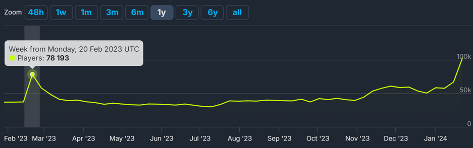Предыдущий рекорд Spacewar по данным SteamDB составлял 78 тысяч, был установлен в феврале 2023 года.