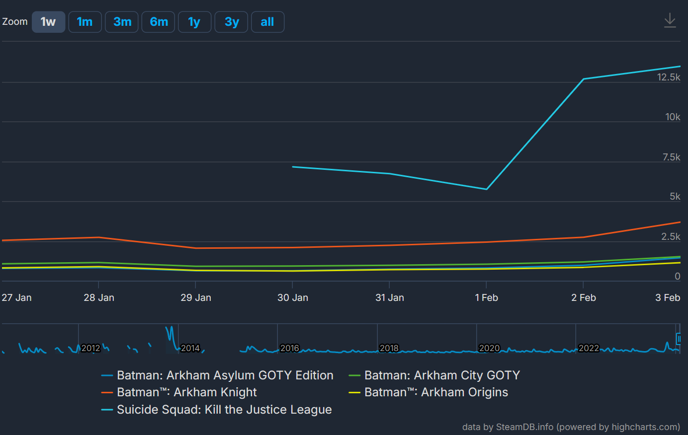 На графике онлайна SteamDB за неделю можно заметить, как за последние дни подрос онлайн у игр Batman Arkham. При этом сейчас в Steam нет каких-нибудь скидок на игры серии.