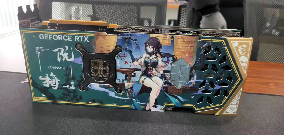 Героиня выступает лицом рекламной кампании (и самой видеокарты) MSI RTX 4090 SUPRIM X Ruan Mei Edition. Она выполнена в характерной «нефритово-золотой» расцветке, для самой Жуань Мэй на устройстве тоже нашлось местечко, она расположилась на задней панели.