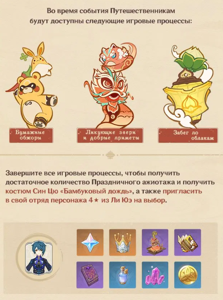 Игрокам в Genshin Impact за прохождение события предложат персонажа с 4 звездами редкости из региона Ли Юэ. Подарок не «случайный», надо будет самостоятельно выбрать желанную персону. Также можно будет заполучить новый скин для Син Цю «Бамбуковый дождь».