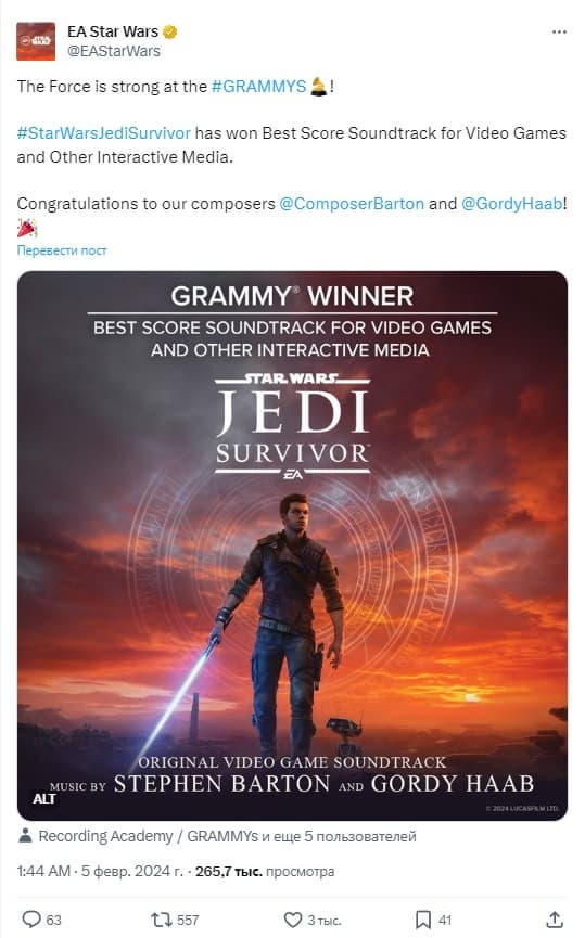 Победителями второго опроса стали Стивен Бартон и Горди Хааб, ответственные за музыку к Star Wars Jedi: Survivor.