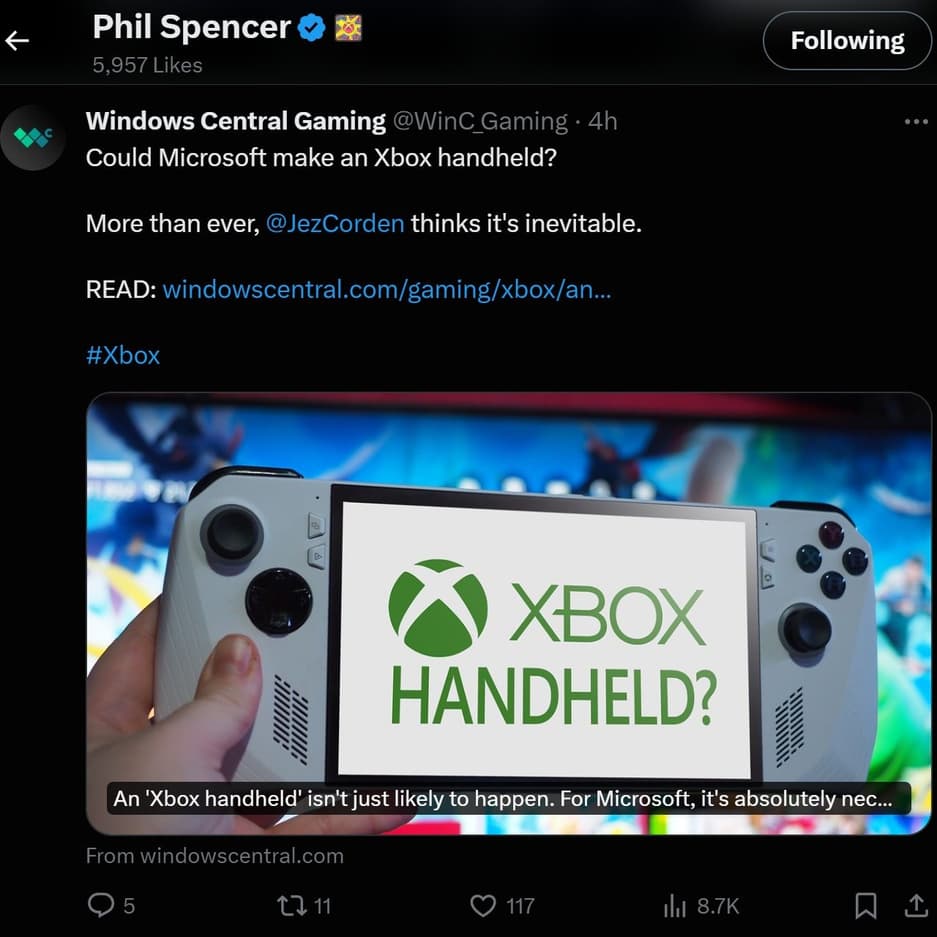 И в этом не было бы ничего необычного, если бы пост о публикации в Twitter не «лайкнул» Фил Спенсер, глава Microsoft Gaming.
