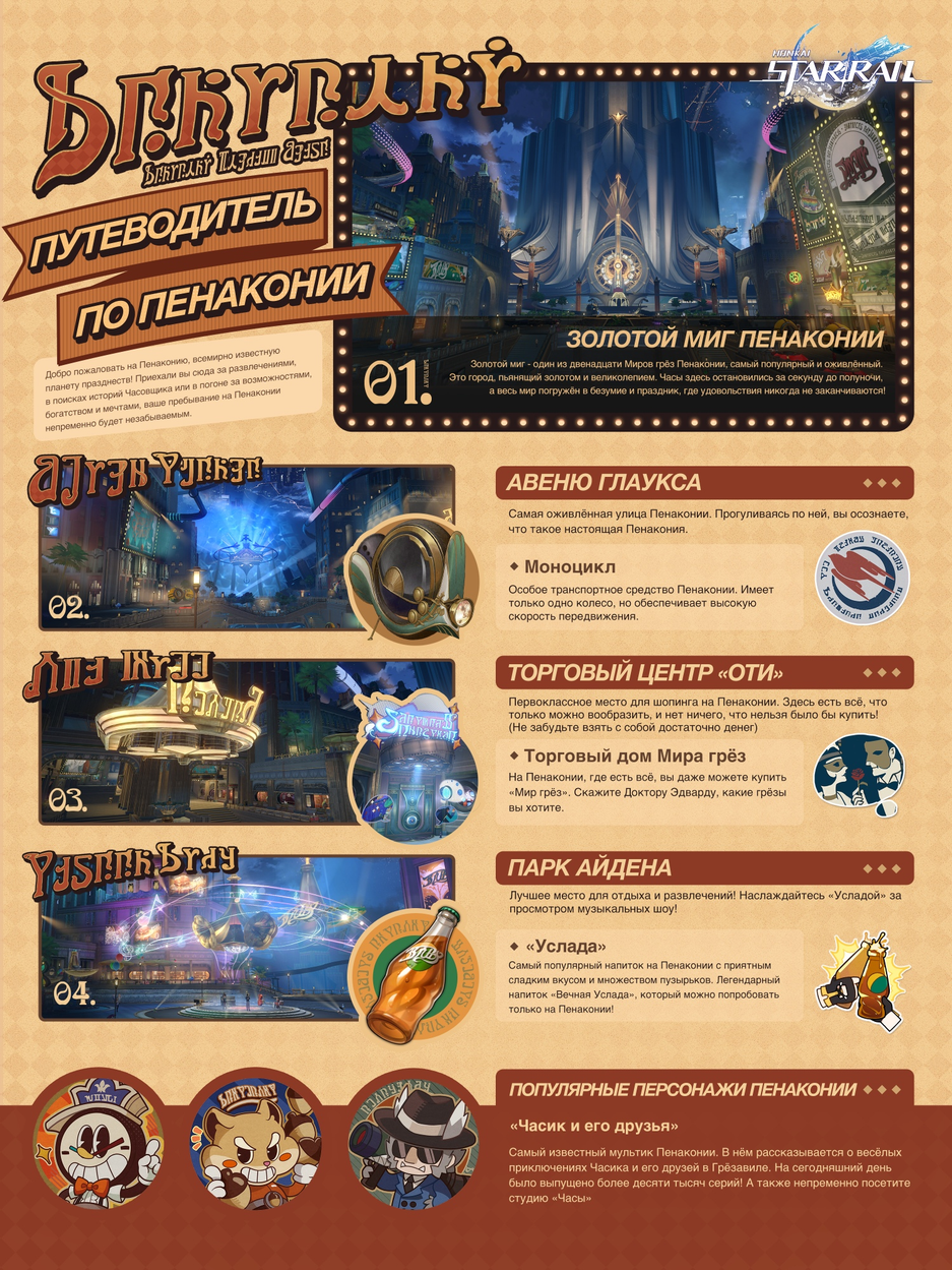 С релизом обновления 2.0 в Honkai Star Rail появился новый мир Пенакония. miHoYo опубликовала стилизованный путеводитель, позволяющий познакомиться с имеющимся контентом.
