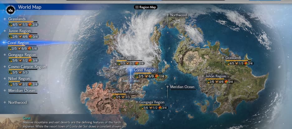 Игровая карта разделена на несколько регионов (в каждом есть список активностей), отличающихся сюжетом, атмосферой и заданиями. В Final Fantasy VII Rebirth будет больше открытых территорий, чем в ремейке 2020 года, но разработчики уверяют, что они не обязательные и помогут лучше узнать намерения отдельных персонажей.