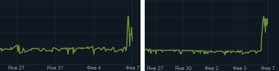 Рынок Counter-Strike 2 отреагировал. По графикам видно, как 7 февраля (в день выхода обновления) взлетели цены продажи стикеров с буквой «N» и «GG» (Good Game), количество совершаемых сделок тоже подросло.