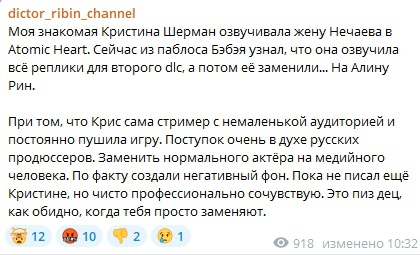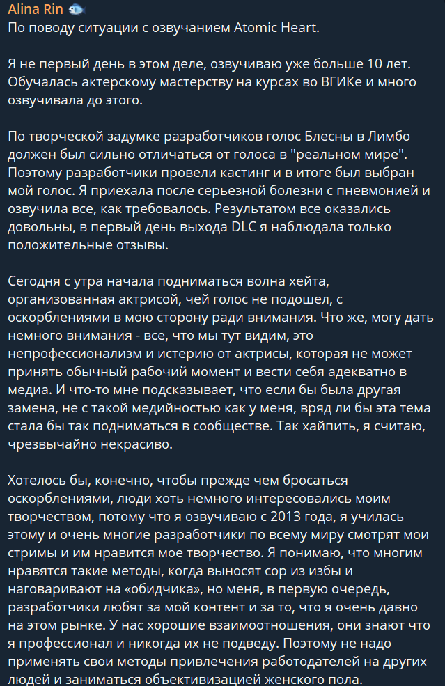 «…Сегодня с утра начала подниматься волна хейта, организованная актрисой, чей голос не подошел, с оскорблениями в мою сторону ради внимания. Что же, могу дать немного внимания - все, что мы тут видим, это непрофессионализм и истерию от актрисы, которая не может принять обычный рабочий момент и вести себя адекватно в медиа. И что-то мне подсказывает, что если бы была другая замена, не с такой медийностью как у меня, вряд ли бы эта тема стала бы так подниматься в сообществе. Так хайпить, я считаю, чрезвычайно некрасиво.