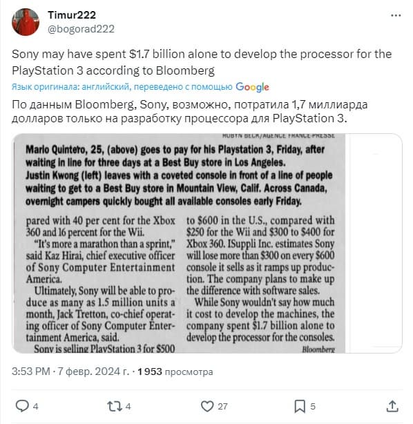 Если сравнить эти инвестиции с типичным APU на базе AMD, используемым в современных консолях, то сумма инвестиций Sony в 1,7 миллиарда долларов, скорее всего, будет в несколько раз выше.