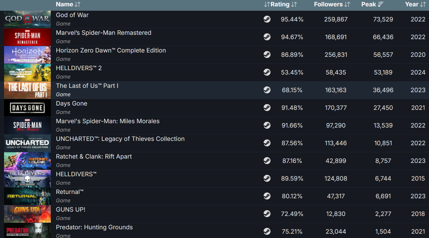 Как оказалось, акция Sony с одновременным релизом эксклюзива на PlayStation 5 и ПК сработала очень хорошо: Helldivers 2 стала одной из самых популярных игр Sony PlayStation в Steam, собрав более 53 тысяч игроков — обогнала The Last of Us Part 1, хотя игра появилась на фоне выпуска сериала HBO.