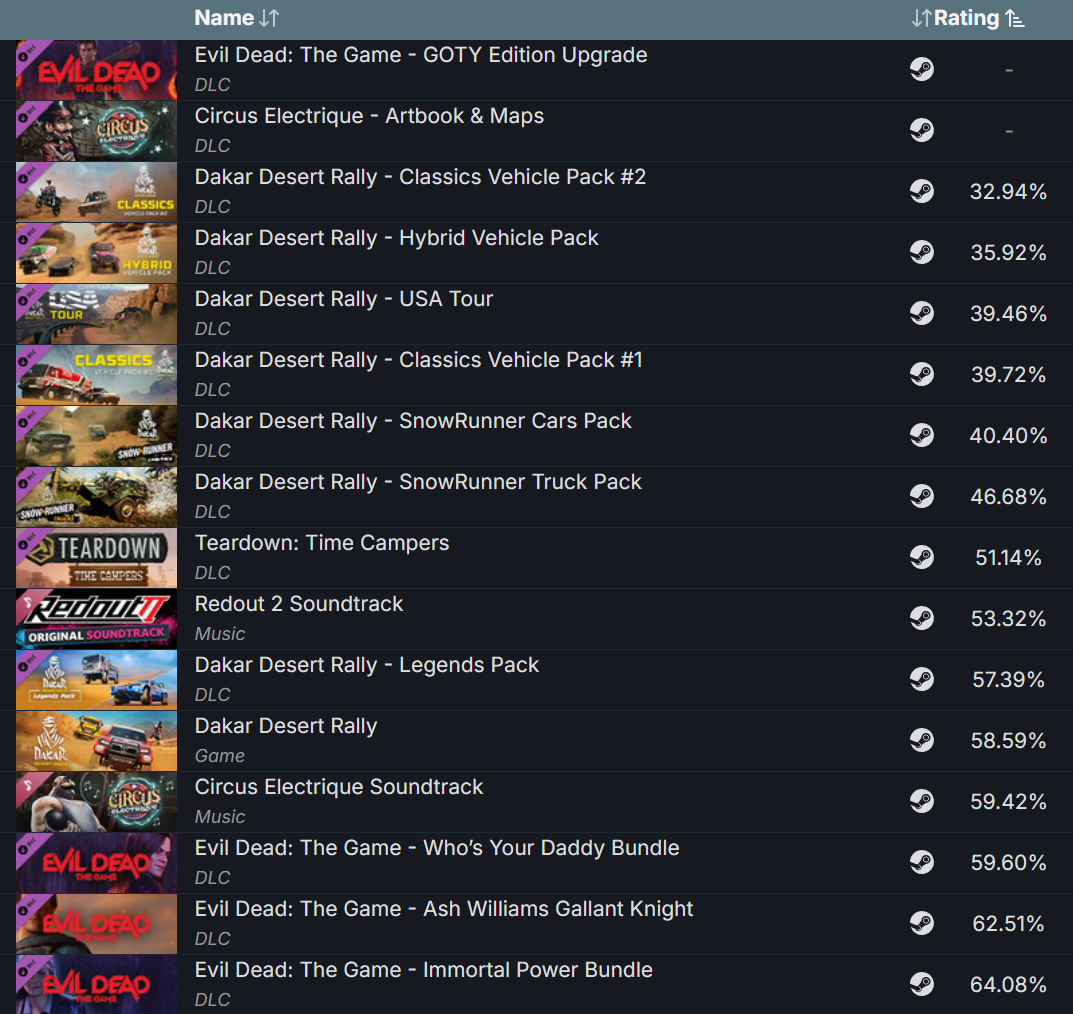 С 15 по 22 февраля 2024 года будут раздавать Dakar Desert Rally. Разработчиком выступила Saber Porto, а издателем Saber Interactive — у игры не самые хорошие отзывы. Так получилось, что в плане рейтинга это один из худших проектов в портфолио Saber Interactive по данным SteamDB.
