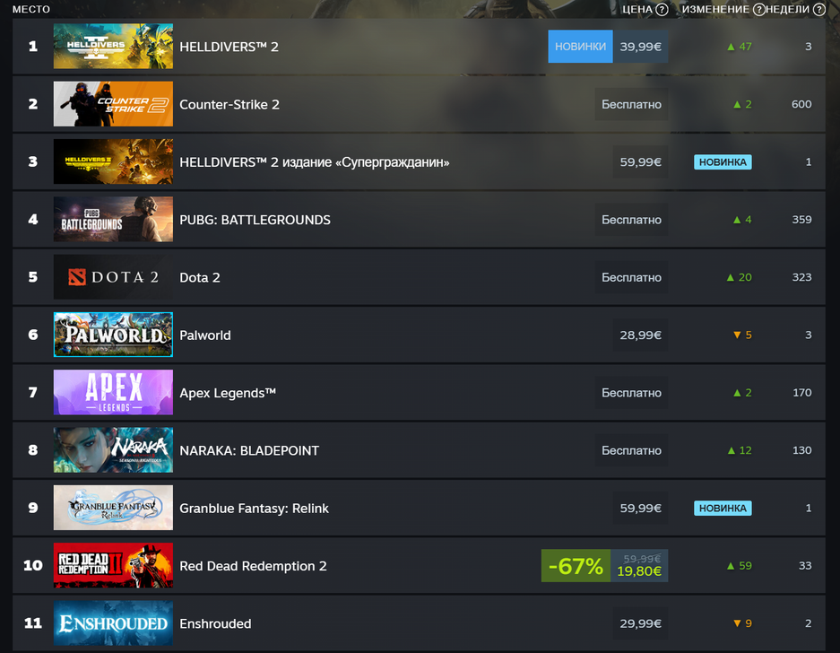 На выходных Helldivers 2 стала самой крупной игрой по объёму выручки в Steam (чарты «Лидеры продаж» работают в режиме реального времени).