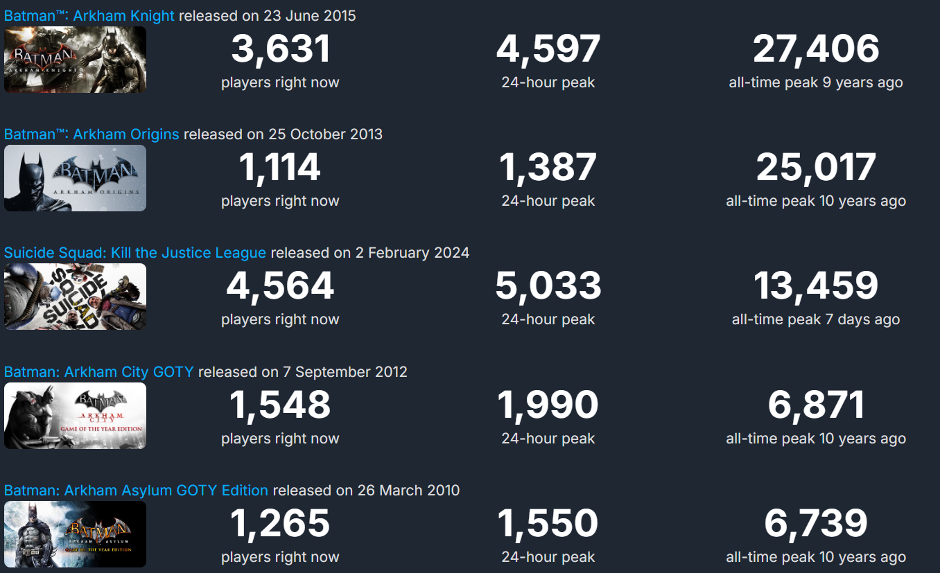 Batman Arkham Knight скоро исполнится 9 лет, а игра по-прежнему привлекает много игроков. По мере приближения к релизу Suicide Squad Kill the Justice League рос интерес к предыдущим работам Rocksteady Studios.