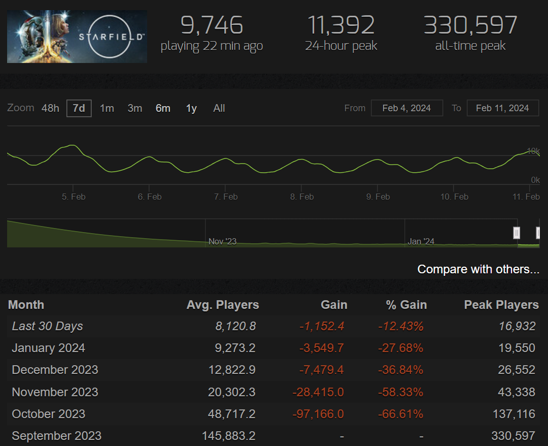 Постепенно онлайн Starfield в Steam стал снижаться. Если на пике он превышал 330 тысяч игроков, то в выходные в феврале 2024 года он чуть больше 11 тысяч игроков. Судя по данным Steam Charts, речь идёт о потере порядка 97% аудитории за полгода.