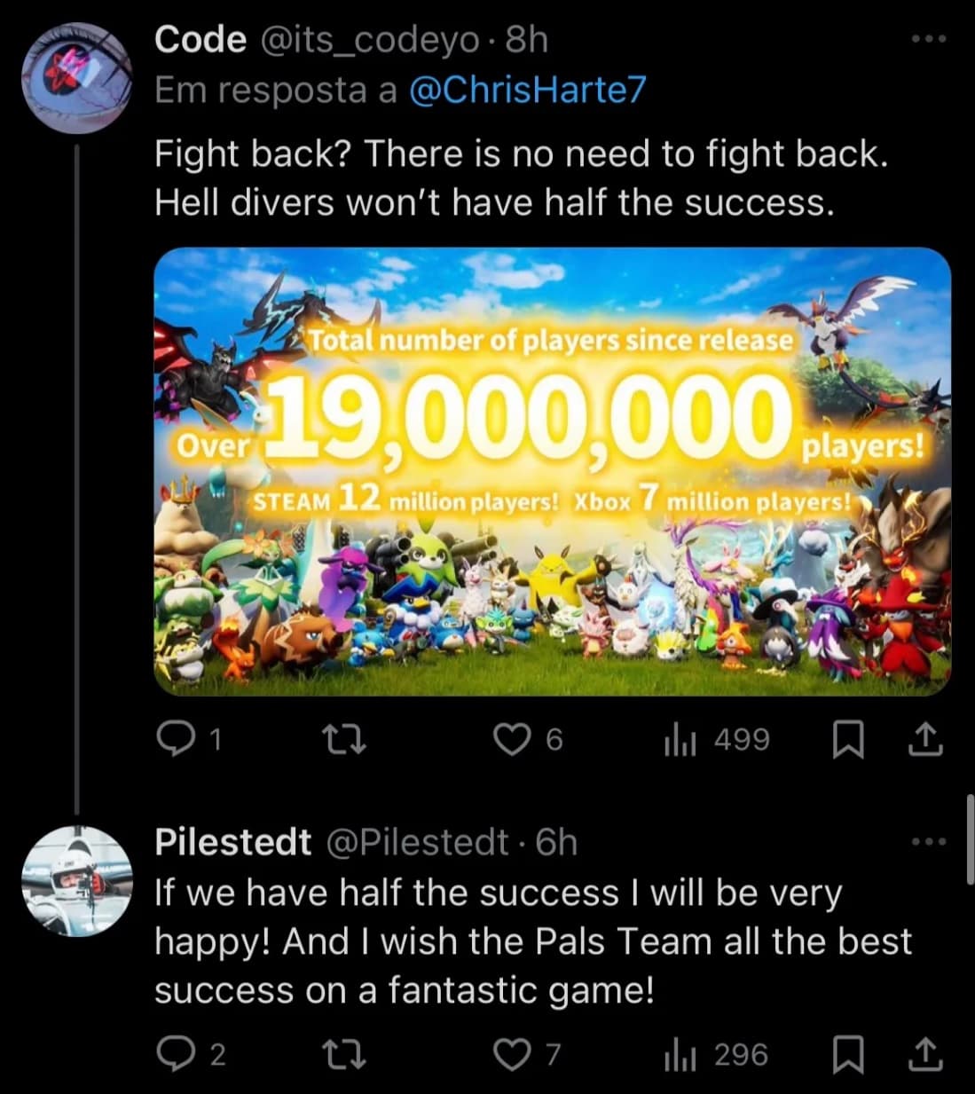 На различные сравнения с невероятно успешными играми, которые достигли впечатляющих показателей, намного превышающих Helldivers 2, Пилестедт ответил примерно так же. Он пожелал Palworld всяческих успехов и рад этому. Более того, он сказал, что если бы их продукт был хотя бы наполовину так же успешен, как Palworld, он был бы счастлив.