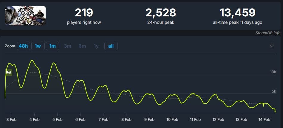 На момент написания этих строчек онлайн Suicide Squad: Kill the Justice League составляет 219 человек, рухнув с 13 тысяч, игравших в фантастическую песочницу об антигероях на релизе.