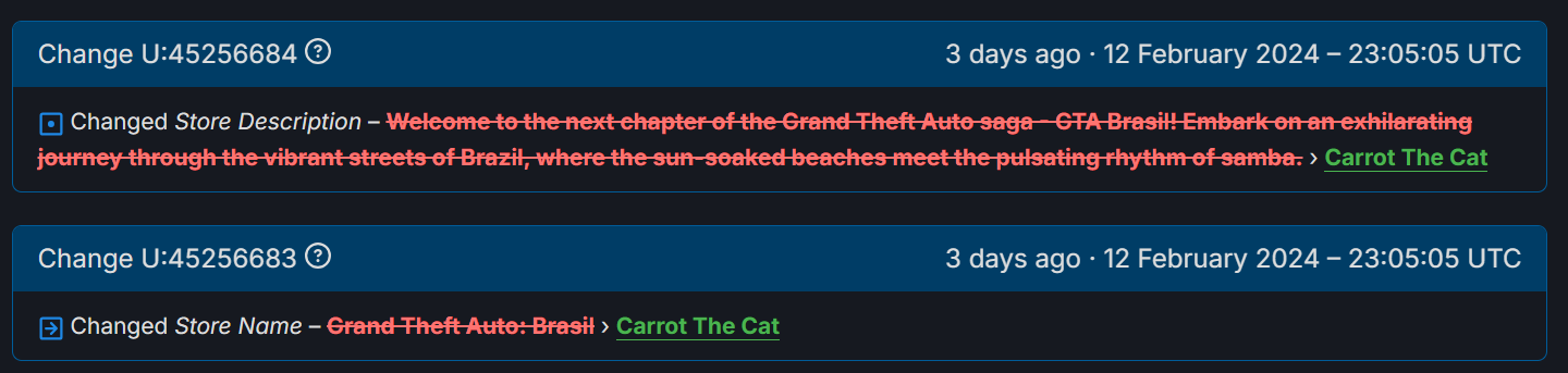 При попытке пробить в базе «2548190» выяснили, что название, а также информацию об издателе и разработчике изменили 15 февраля 2024 года. В этот же день добавили скриншоты игры и новое описание.