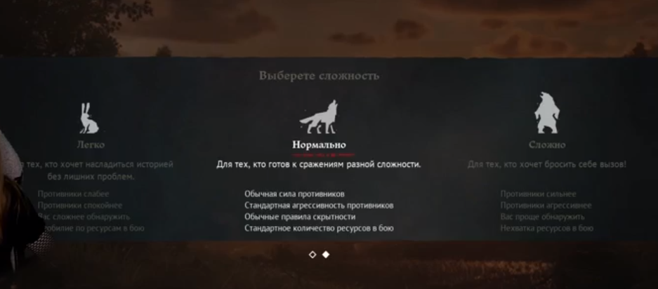 Перед началом игры предлагают выбрать сложность, в наличии 3 варианта, которые отличаются по силе противников, степени их агрессивности, количество ресурсов, а также сложность оказывает влияние на стелс-моменты (врагам будет проще обнаружить главного героя).