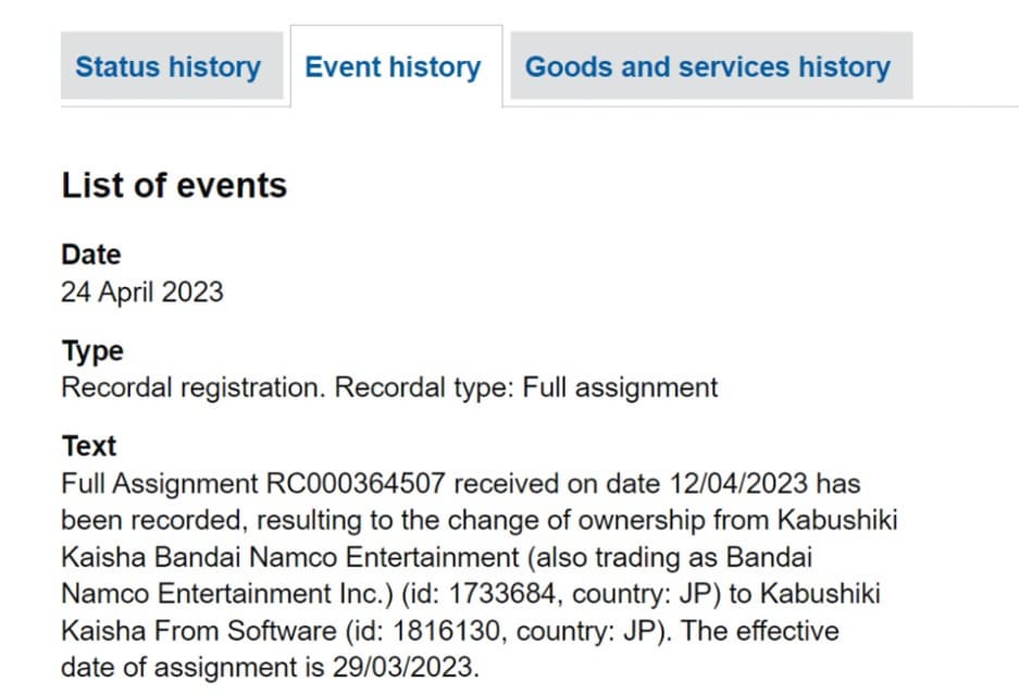 На Reddit заметили о внесении обновления в записи о товарном знаке Elden Ring, и теперь владельцем значится FromSoftware. Изменение вступило в силу 24 апреля 2023 года, хотя торговая марка обновлена только сейчас.