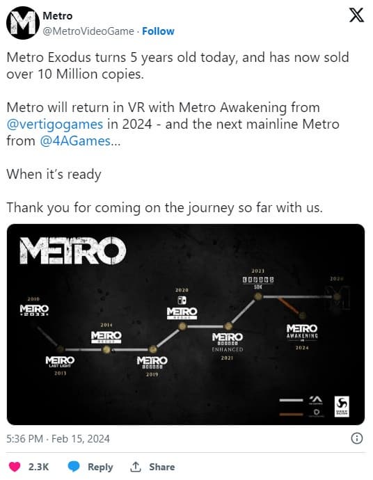 Сейчас 4A Games сосредоточена на производстве спин-оффа Metro Awakening, который разрабатывается для шлемов виртуальной реальности и выйдет в 2024 году. Но разработчики решили отпраздновать день рождения третьего приключения Артёма.
