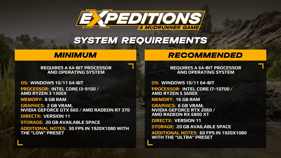 Рекомендуемые системные требования Expeditions A MudRunner Game (60 FPS при 1920 х 1080p на Ultra-настройках):
