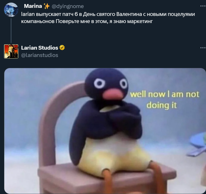 Внимание участников сообщества Baldur's Gate 3 привлёк пост пользователя Marina. Он появился за несколько дней до 14 февраля. Поскольку с шестым крупным патчем разработчики предлагают улучшенные поцелуи, было высказано предположение, что релиз состоится именно 14 числа. На этот пост обратила внимание Larian Studios и ответила «отказом» при помощи мема.