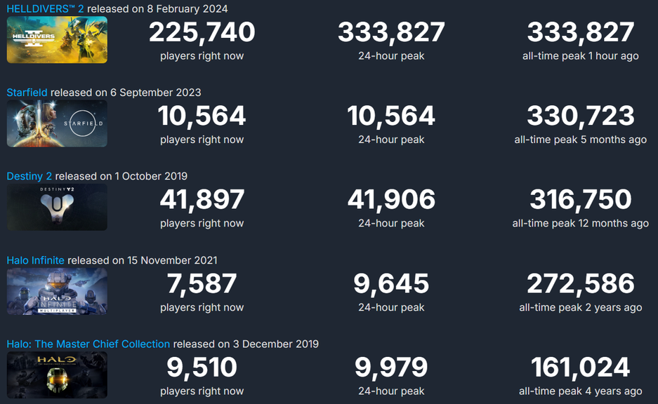 Нашумевшая в 2023 году Starfield от знаменитой Bethesda Game Studios может похвастаться лишь онлайном 330 723 (хотя она с релиза была представлена в Xbox Game Pass, тем не менее есть пример Palworld с 2+ миллионами онлайна). Рекорд условно-бесплатной Destiny 2 тоже был побит.