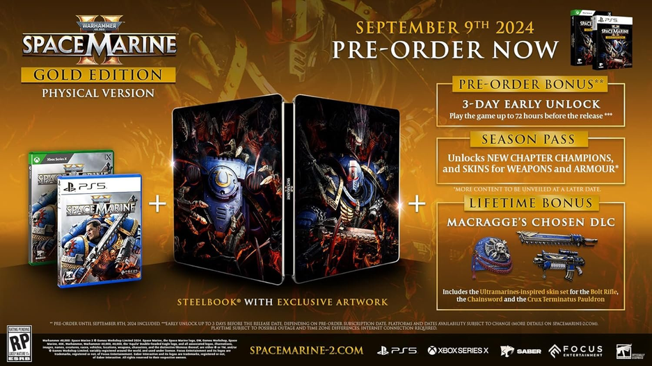 Пока релиз Warhammer 40,000 Space Marine 2 запланирован на 9 сентября 2024 года. Будет не только коллекционное, но и Gold Edition со стилбуком, сезонным пропуском и другими бонусами.