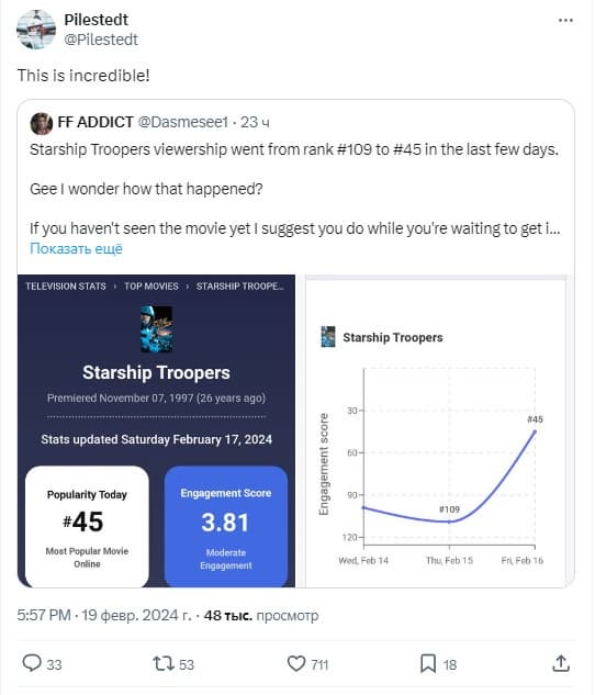 Этой информацией поделился непосредственно Пилестедт, генеральный директор команды разработчиков Helldivers 2, который опубликовал сообщение от фаната, подчеркивающее явный скачок просмотров «Звёздного десанта» после запуска игры для ПК и PS5.