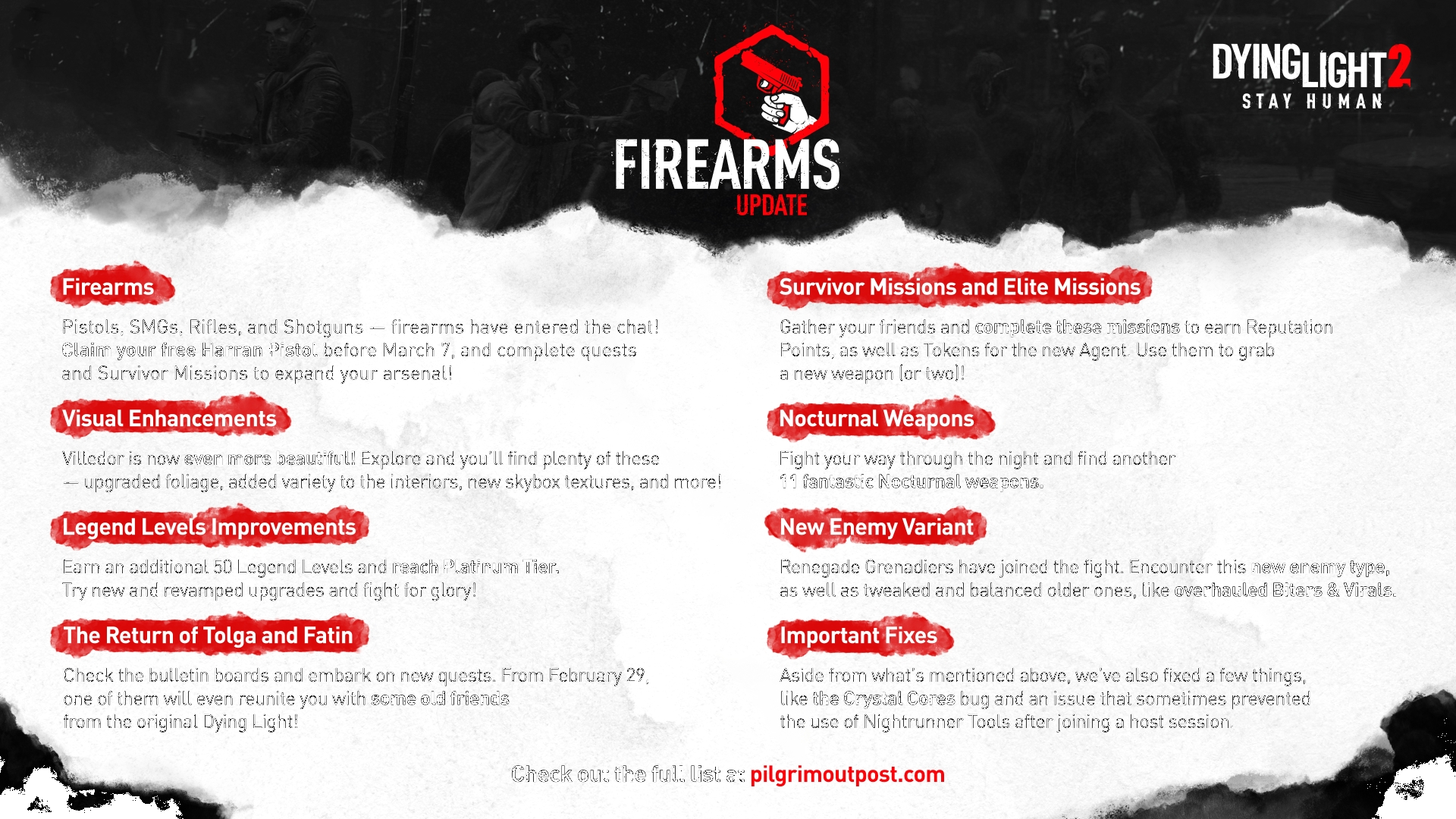 Techland предлагает несколько видов огнестрела, в наличии: пистолеты, дробовики, пистолеты-пулемёты и штурмовые винтовки. Также в Dying Light 2 представили дополнительные задания, например их можно активировать через доску объявлений, и появился новый тип врага.
