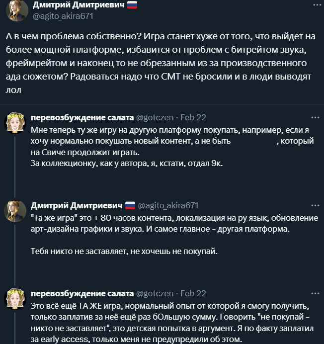 Ожидаемо, данное событие запустило волну обсуждений в социальных сетях. Среди многих высказавшихся отметилась геймерша под ником «Рогатая они» (или @ Runioni), написавшая: «Люблю политику японских игровых компаний» и дополнила свой пост фотографией коллекционного издания оригинальной Shin Megami Tensei V для Nintendo Switch, которое отправилось в мусорный бак.