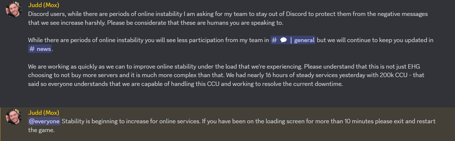 «Пользователи Discord, во время периодов нестабильности [серверов], я прошу свою команду не заходить в Discord, чтобы защитить их от негативных сообщений, которые мы видим всё чаще».