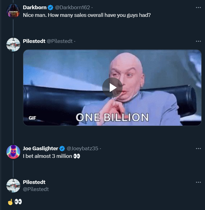 Многих интересует, как обстоят дела с продажами Helldivers 2 на фоне столь громкого запуска и популярности. Один из разработчиков сначала отшутился, опубликовав GIF-изображение с «миллиардом», но затем в комментариях объявился Joe Gaslighter, предположивший, что тираж Helldivers 2 составил 3 миллиона копий. Разработчик не стал прямо говорить «да», но опубликовал смайлик, который многие посчитали подтверждением.