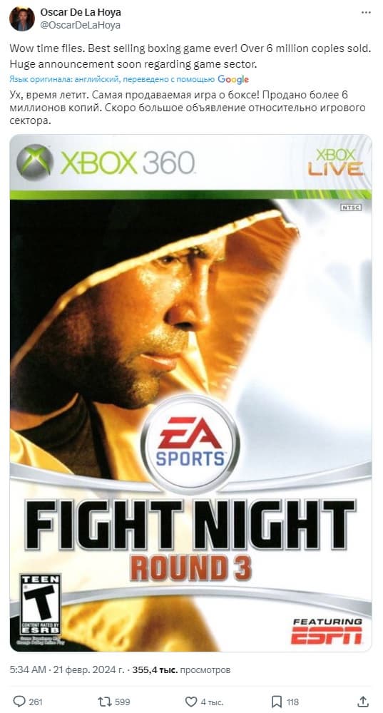 Вышеупомянутый боксёр опубликовал сообщение в Twitter, в котором упомянул огромный успех Fight Night: Round 3 и сообщил, что в скором времени в секторе спортивных игр произойдёт какой-то большой анонс.