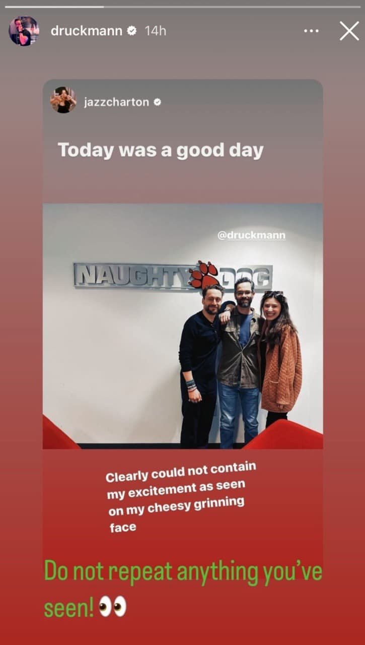 Дракманн поделился фотографией в профиле в социальной сети, добавив: «Не повторяйте ничего из того, что увидели!». Значит ли это, что Дракманн показал фрагменты новой игры, над которой работает Naughty Dog? Или это просто дружеский визит?