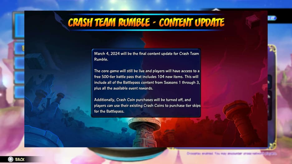 Разработчики скоро выпустят финальный патч с релизным контентом, который появится в игре 4 марта 2024 года. Пока серверы Crash Team Rumble не будут отключать, но из игры уберут микротранзакции будут отключены, а игроки получат доступ к бесплатному пропуску, содержащему 500 уровней, 104 новых предмета и контент из 1-3 сезонов.