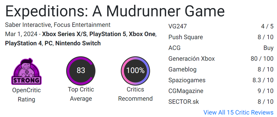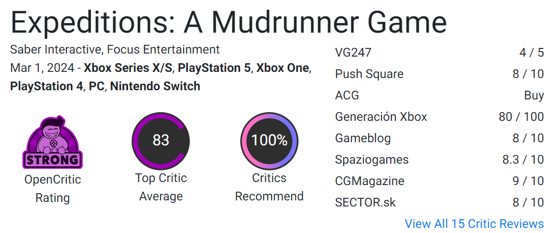 29 февраля в сети стали публиковать обзоры, у Expeditions A MudRunner Game на Metacritic сформировалось оценка 80 баллов из 100, на OpenCritic у игры ситуация чуть получше — 83 балла из 100, при этом рекомендуют 100% приобщившихся к проекту.