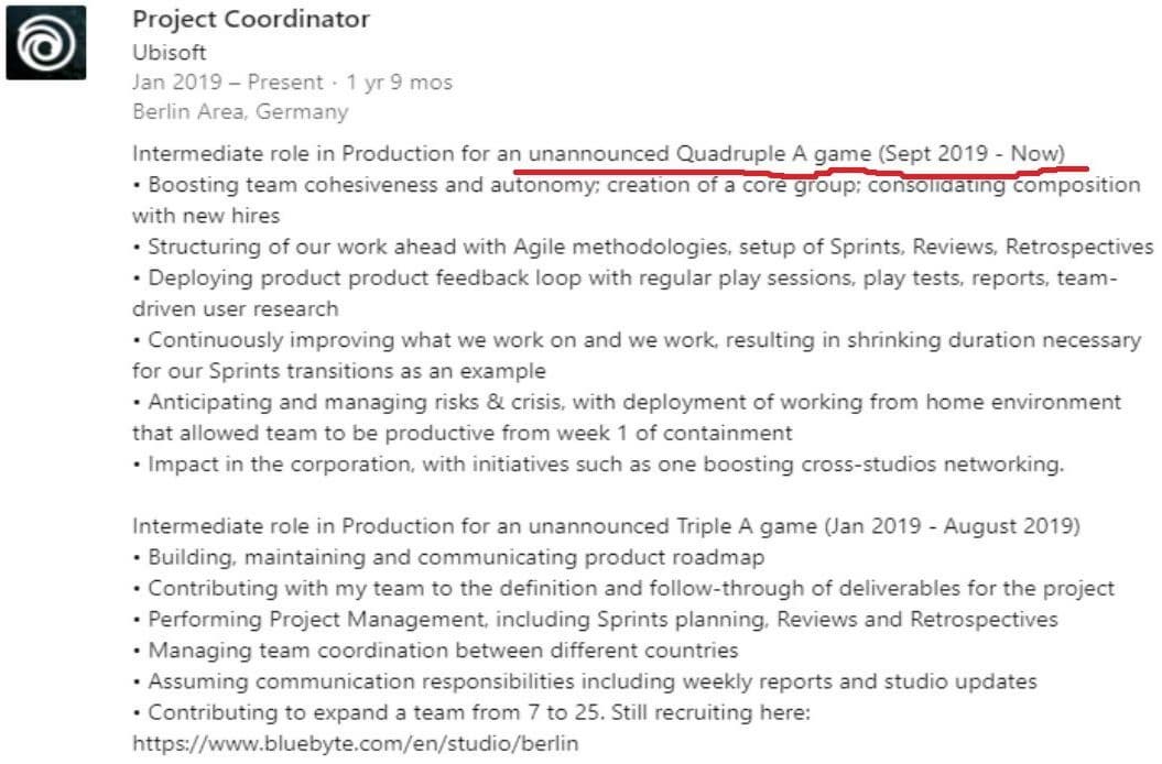 В твите от сентября 2020 года сообщалось, что Ubisoft Berlin разрабатывает игру уровня «Quadruple A», о чем свидетельствует профиль координатора проекта в LinkedIn. Теперь стало известно, что этой игрой была Far Cry 6.