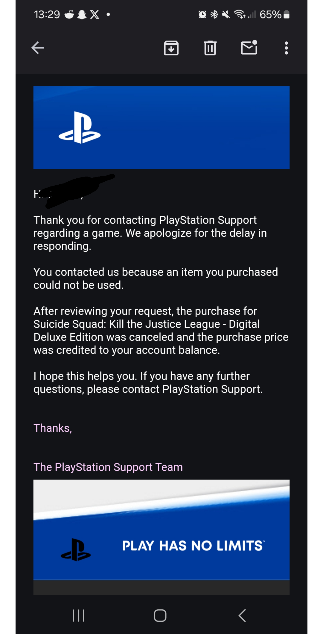 Пользователь Tris опубликовал на Reddit скриншот, показывающий, что Sony вернула деньги за покупку Suicide Squad, сославшись на жалобу о том, что «купленный вами предмет не может быть использован». Игрок говорит, что подал запрос и не ожидал ответа, учитывая, что PlayStation не осуществляет возврат средств за исключением крайне редких обстоятельств. Но, похоже, это крайне редкое обстоятельство.