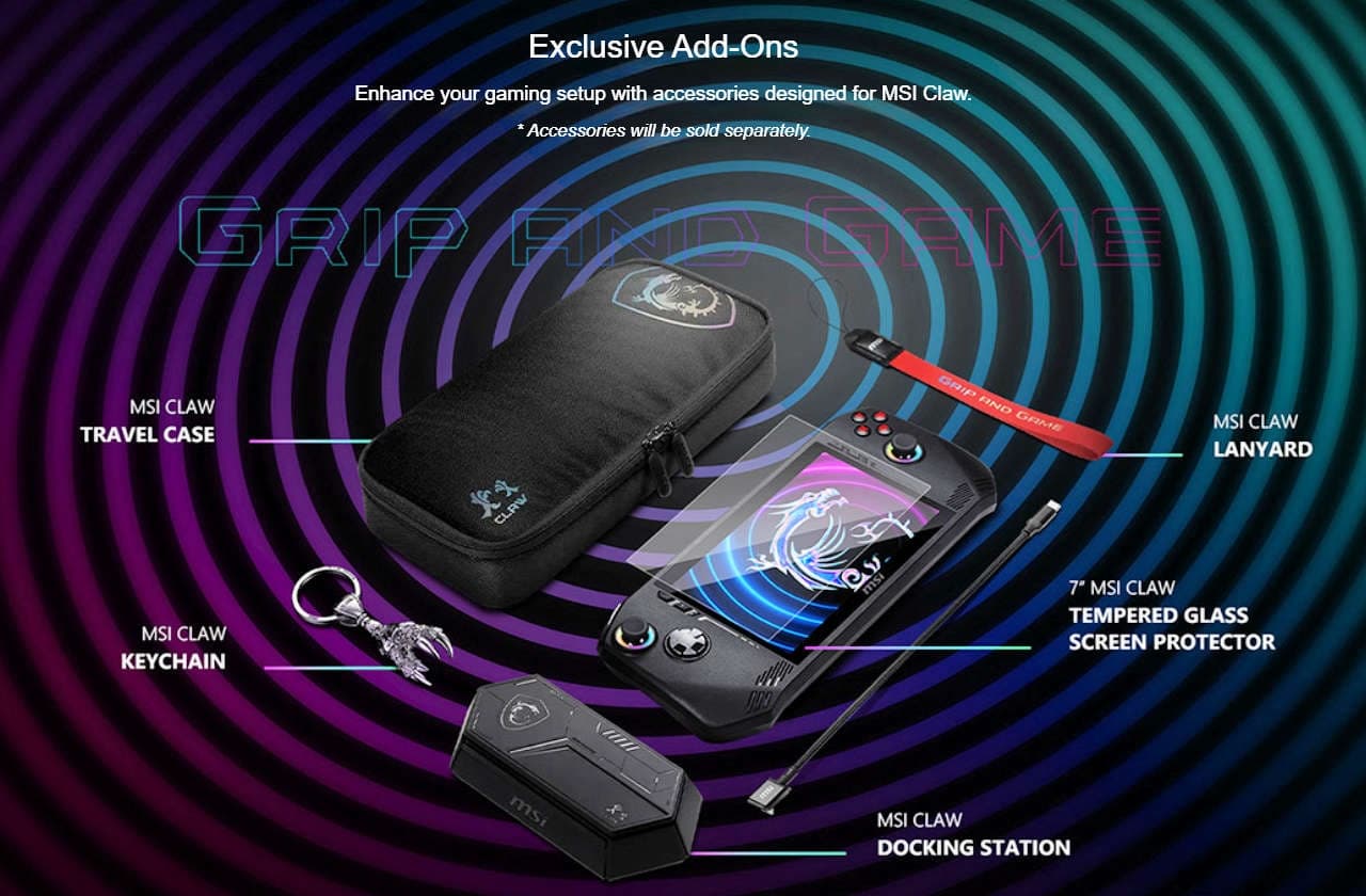 В комплект поставки MSI входит набор аксессуаров Claw, включающий док-станцию, дорожный чехол, защитный экран и брелок MSI Claw.
