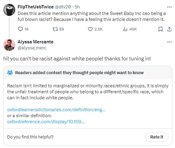 Когда у написавший материал журналистки Алиссы Мерканте спросили в сети, упомянуты ли в статье расистские высказывания Белэр, та ответила, что в адрес белых людей не может быть расизма. Пользователи X затем объяснили Мерканте, что мир устроен не совсем так, как она себе его представляет в своей голове, и что расизм может быть направлен в адрес людей с любым цветом кожи.