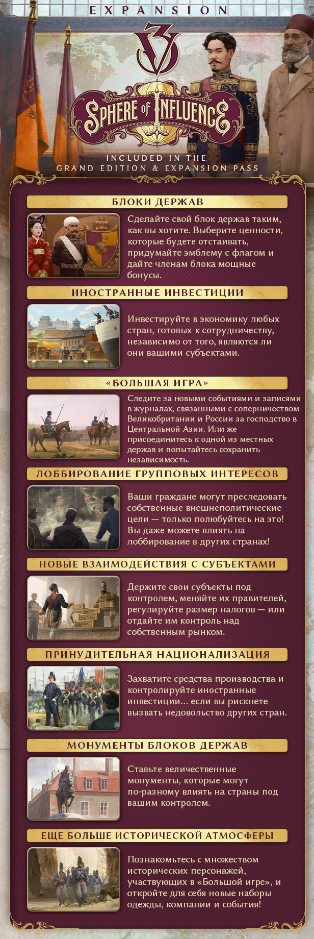 «[Дополнение] добавляет множество новых действий и систем, иллюстрирующих быстро меняющийся характер дипломатических отношений в эту напряженную эпоху. В частности, вас ждет новый контент, посвященный "Большой игре" — многолетнему соперничеству между Британской и Российской империями за господство в Северной Индии и Центральной Азии».