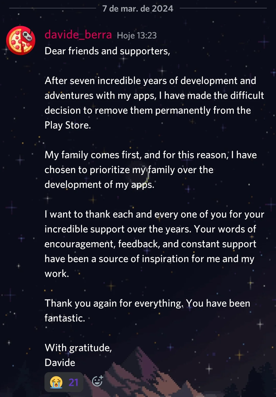 Формально это связано с тем, что разработчик Pizza хочет отдать приоритет своей семье.