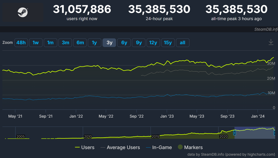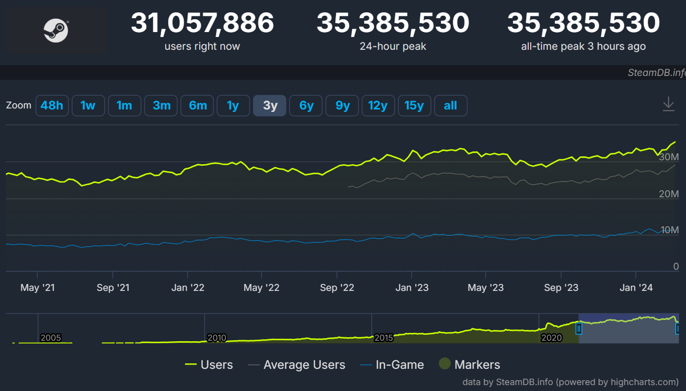 В начале марта 2024 года сервис SteamDB зарегистрировал новый рекорд Steam. Сервис Valve впервые превысил 34 миллиона пользователей.