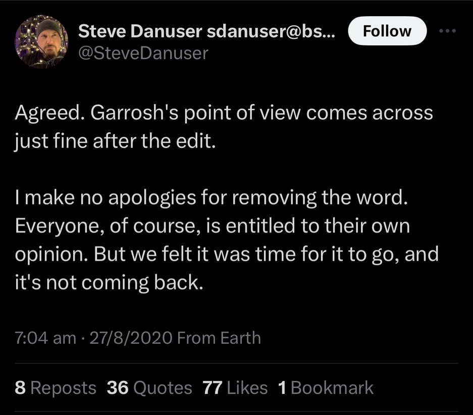 «Тогда же Денузер заявил, что извиняться за это изменение не будет и удаленное слово никогда не вернется в игру. Иронично, что фраза все же вернулась, пусть и в классической версии игры, а сам Стив уже не работает в компании».