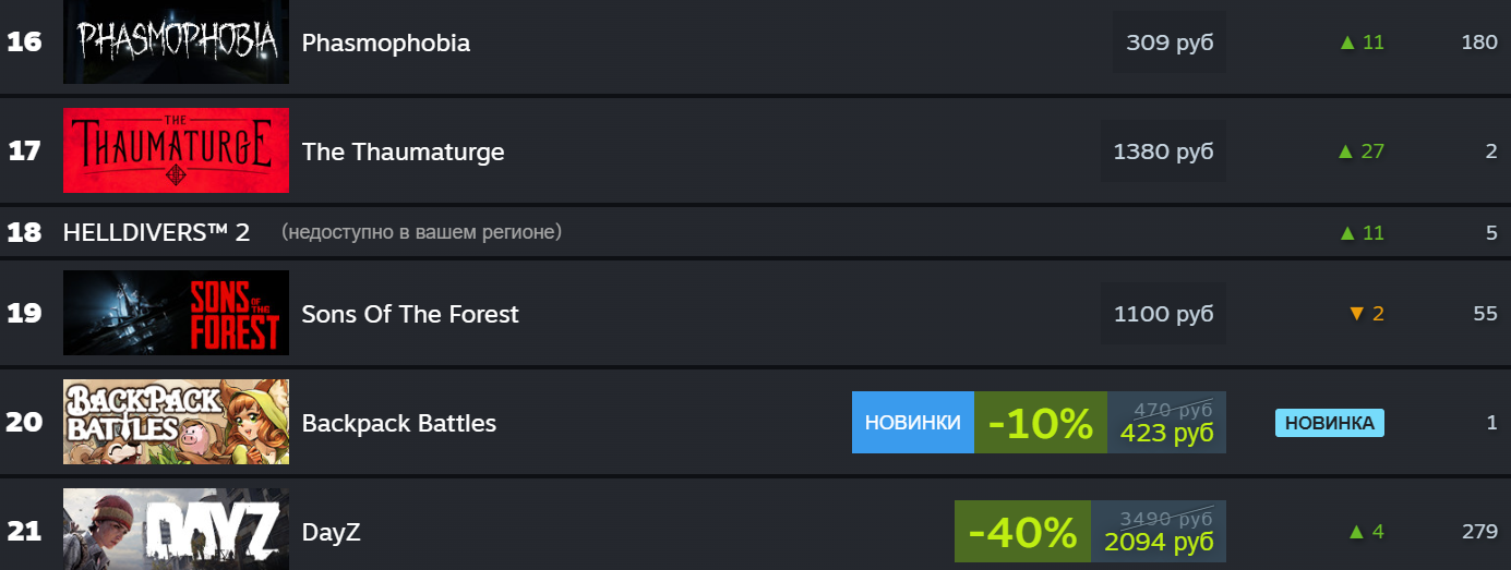 Рейтинг продаж Steam основан на объёме выручки: по итогам прошедшей недели Helldivers 2 оказалась на 18 месте между игрой The Thaumaturge за 1380 рублей и Sons Of The Forest за 1100 рублей.