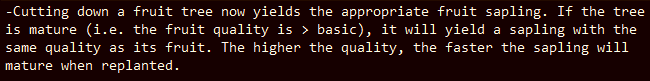 «Срубив фруктовое дерево, вы получите соответствующий саженец фруктового дерева. Если дерево зрелое (т. е. качество плодов > базового), оно даст саженец с тем же качеством, что и его плоды. Чем выше качество, тем быстрее созреет саженец при пересадке».