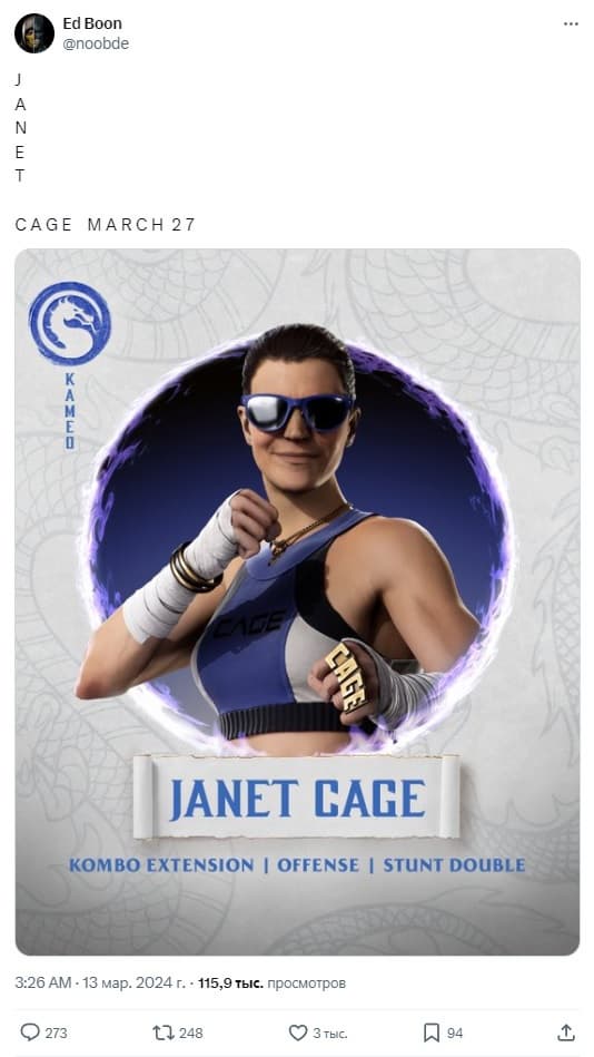 Но студия держит слово и Джанет Кейдж скоро появится в игре. Netherrealm Studios, а также отец серии, Эд Бун, сообщили, что боец будет доступен 27 марта.